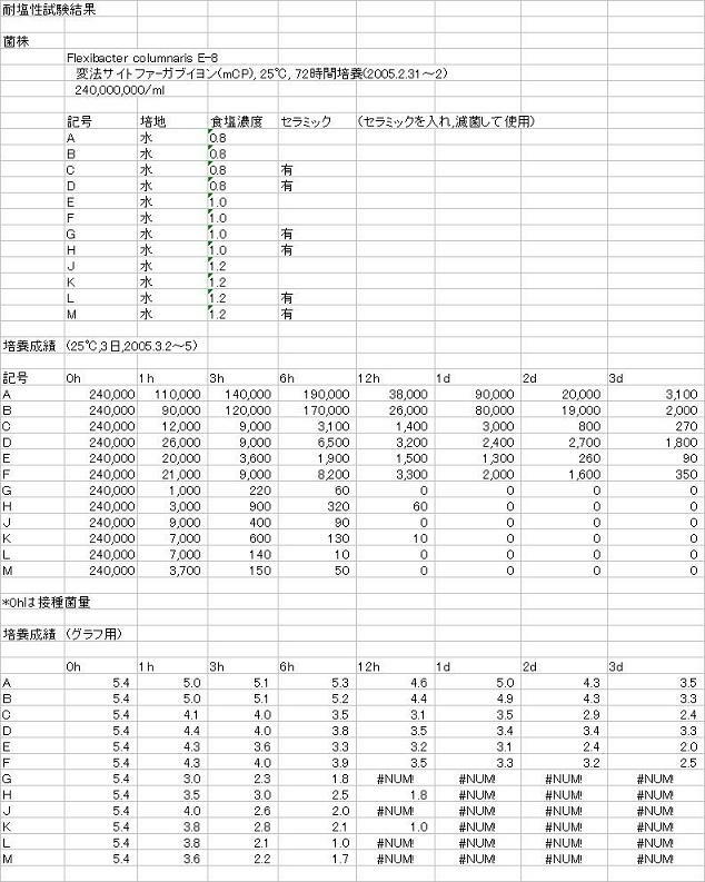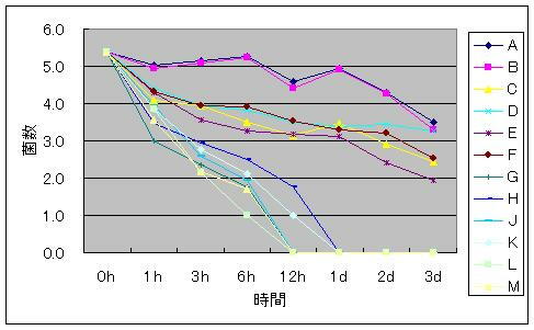 ちょっと難しいけど、時間と菌数の減少傾向を塩水0.8%/1.0%/1.2%で試験した結果をグラフ