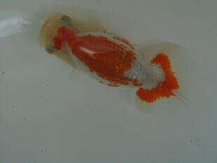 中の二匹のらんちゅうは昨年と同じものです。綺麗な青水で魚も随分大きくなっています。