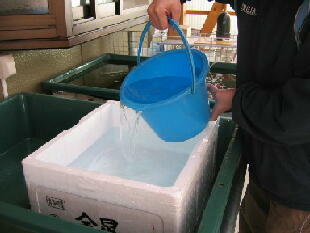 1.隣の舟に3割程度の塩素を抜いた更水(飼育水より1〜2度高め)を入れ、バスポンプでバイ
