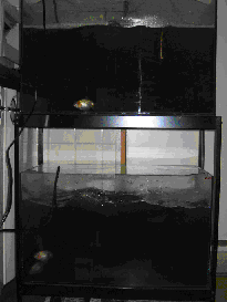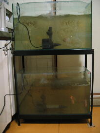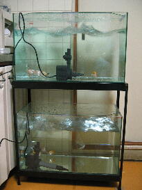 水を循環させました。その際に水中ポンプから噴出す水を水面から数センチ上げる事で水中 内の酸素供給を図りました。この水中ポンプのうち、上の水槽に設置されているのが普通の水 中ポンプです。
