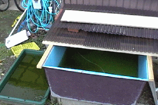 日稚魚飼育環境です。プラ船60がハネ魚の常温バイオ飼育FRP300が選別後の保温バイオ飼育す。