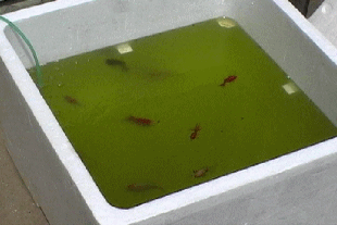 この容器は下だけ光が入るように黒テープを貼ってます。(ブラインの幼生は光に集まります。) |