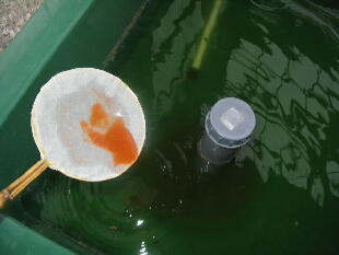 大きい池でも稚魚にバイオシークスルーを投入しています。水換えの回数を大幅に減らせるので、大変経済的(労力も)です。餌の食べ残しによる水の傷みによる病気も安心です。