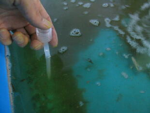 舟の縁に付いたブラインの(殻)カスもさっと流しましょう。水道水の場合、ハイポ(塩素抜き)を入れて最低10分程度はエアレーションしてください。(水温はお湯を使って元の飼育水と同じにします。)