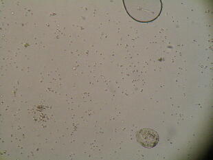 | <第二回目>舟の底の水を顕微鏡で調べてみました。数種類のバクテリアがすごく良く湧いています。右角下の大きく見えるものがプランクトンです。バクテリアをむさぼり食っていました。 |