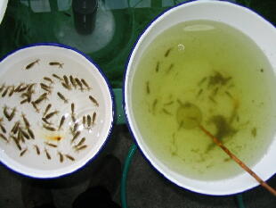 ブラインシュリンプのカスも茶色なって解けているようです。稚魚も絶好調です。土曜日には選別して見ます。黒仔になるころに15匹程度を残そうと思っています。もちろん足し水のみで・・・・ |