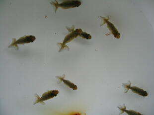 | この画像(プレゼント稚魚ト同じ)は同じ日に生まれた仔です。同じサイズの舟で左画像は密飼い/右画像はゆとり飼いの仔です。一週間ちょっと程度でこれだけ差がついてしまいました。ゆとり飼育が良いらんちゅうをつくるコツですね。ゆとりを持った飼育は病気にも安心ですよ。なんちゃって! |