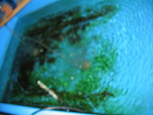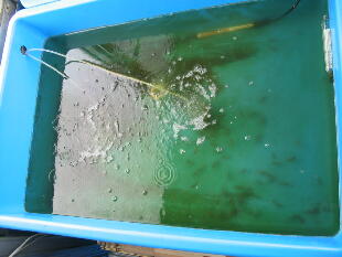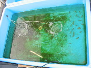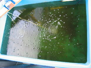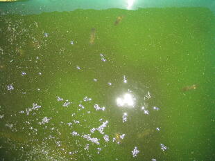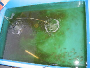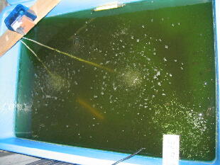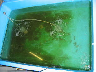 し早めに水換えしてください。(水換え方法は2005年4月28日を参考にしてください)青水はバク テリアの餌だけではなく、非常に重要な役目を果しています。今後、青水とバクテリアの関係を 少しお話して行きますね。