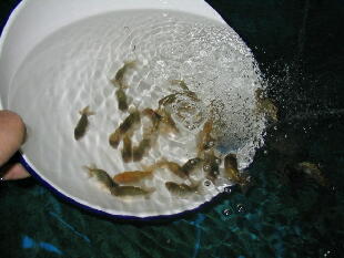 塩素抜き(ハイポ)を入れて、水温が合っているか確認して、洗面器一杯の古水と一緒に魚を戻します。