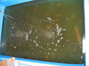 顕微鏡で確認できますが、舟の縁や底にたくさんのバイオバクテリアが付いています。バイオ飼育なじみ舟の完成間じかです。ここまでくれば安心ですね。 |