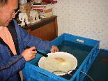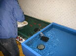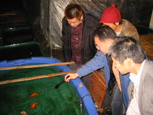 をさせていただきました。会員の皆さんのレベルアップのため購入した魚ではなく、自分達で創 り上げた魚を出陣する決まりになっているそうです。今年は当歳のみの品評会ですが、いづれ はりっぱな弐歳/親魚が洗面器に並ぶことになるでしょう。 審査方法は洗面器審査でランク付けをした後、順位を決めました。