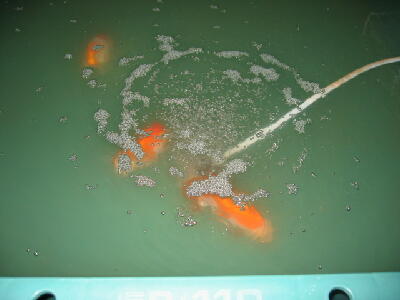 撮ることが出来ました。日中の魚の状態が良かったので,2/3程度水を替えました。置き水が 入った時、エア−レ−ションに変化ありがありました。泡が下から上へと上がって行き水面で弾 けそうになった時、真上に10cm位上に泡が飛び散っていました(炭酸をコップに注いだ時のよ うに)が先ほど見たときは、その様子も無くいつも通りでした。