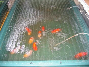 昨日の夕方より波板(クリア系統)使用しましたが、朝水温が下がらなく魚達は元気に泳いでい