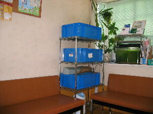 三歳です。待合室の三段のプラケース27Lの船に装置を付けて一日一回のペレットを与えて