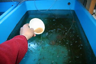晴れた暖かい日は餌を多めに寒い日は少なめに、また、水換え後は多めに水換え前(水か汚