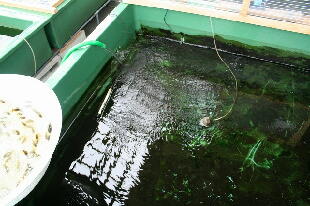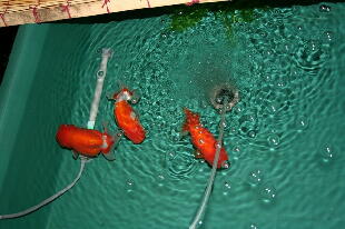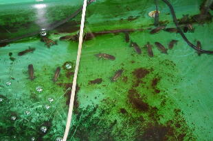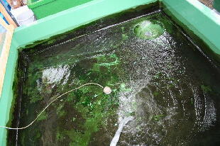 年のバイオ飼育でも、らんちゅうは水の透明度がなくなると泳がなく(運動不足)なりますので、 腹が出てしまい尾ができてきませんでした。