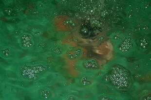 バイオ飼育中のプラ舟にバイオの泡が立ち始めました。あっ!これは一雨来るな!と思いき