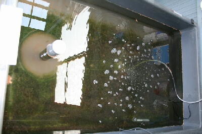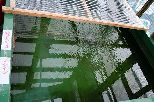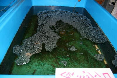 なっています。また、水道水に含まれる塩素程度では一度活性化したバイオシークスルーのバ クテリアは大きな影響はありません。水道水を入れハイポを入れて10分程度で魚を舟に入れ ます。この舟(内寸1500×1500)で60cm洗面器一杯の元水(バイオ飼育水)を魚と一緒に割 り水として入れます。<注意>水温合わせが一番重要です。水道水や貯水タンクの温度が低 いときは湯沸かし器のお湯で水温調整をします。