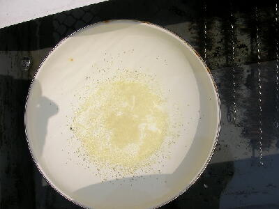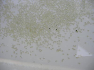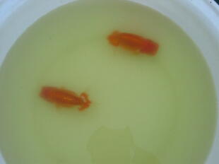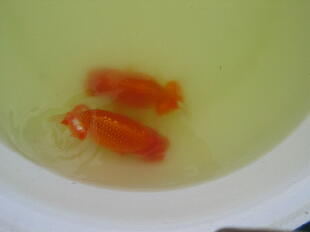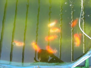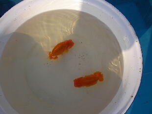 を見ると白い卵が目立ちます。魚達を洗面器に掬い紫外線の当たらない場所に移動させて人 工授精をしました。人工受精で気をつけなければならないのは水中から魚を取り出して卵と精 子を絞る際に決して紫外線に当てない事です。今回は一寸平べったいボール