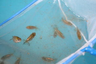網でゆっくり寄せて手で魚をすくいます。大事に扱わないと尾先を傷つけちゃいますからね。
