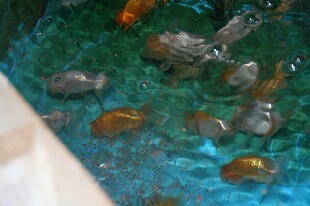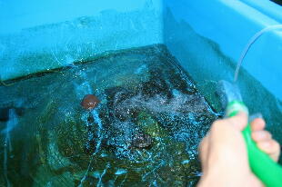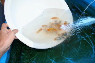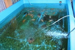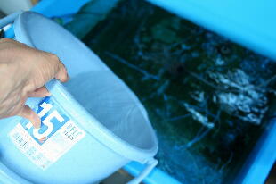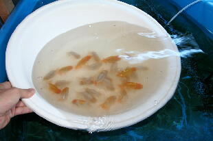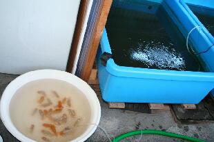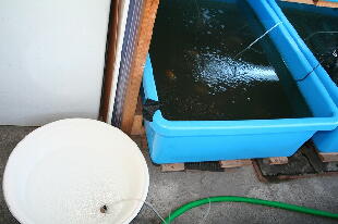 ・舟に水道水が溜まったらハイポを入れて5分ぐらいで魚を放流 (洗面器に永く魚を入れておくのが