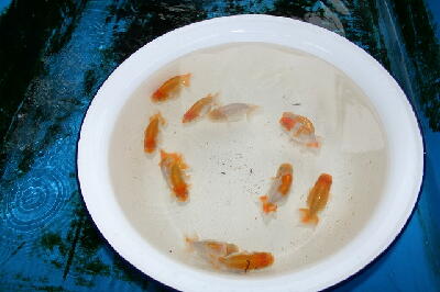 各プラ舟は12匹ずつまで減らしました。洗面器に1/5ぐらい割り水をして水換えしています。