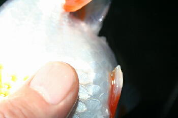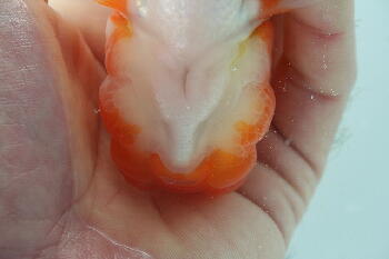 強く押すと身がでそ〜!たまに、堅いまま産卵するメスもいますね。 |
