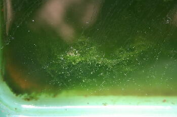 | ミジンコが角に固まってじっとしています。泳ぎだしているミジンコも目立つようになってきました。 |