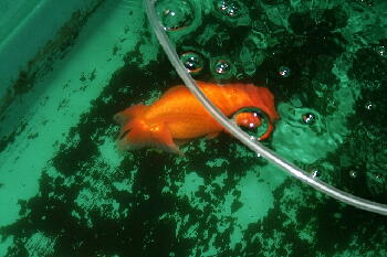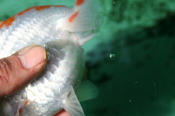 洗面器で魚を移した瞬間、オスが精子をドバッ!!オスの仕上がりが早過ぎるかも・・・