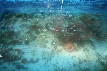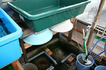 下の段のろ過器付きプラ舟はハネた仔が次から次へ入っていきます。