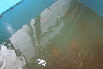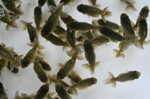 こちらは、一回目の選別後、一ヶ月以上水換えをしていない黒らんちゅうの仔の舟です。