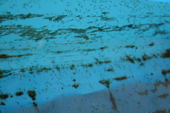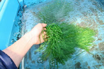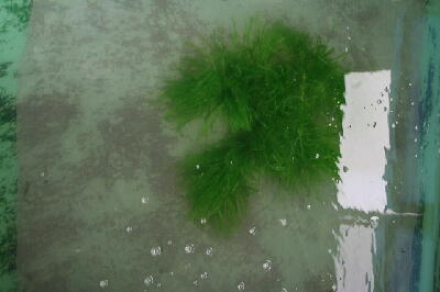 餌(ブラインシュリンプ)を与える前に産卵藻や網を外します。後に伸ばすとゴミが舞って大変!
