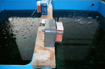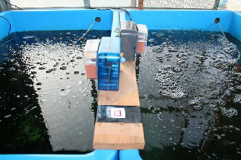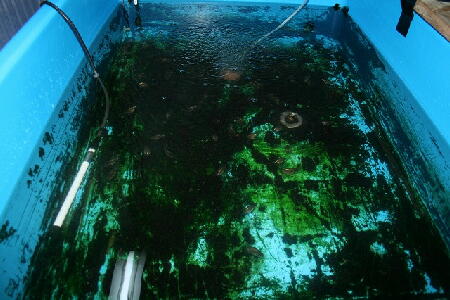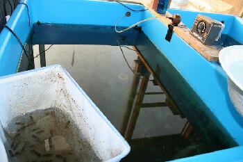 舟は水道水でブワ〜っと洗って終了ですが、ヒーター、サーモなどの機器はスポンジでしっかり洗い流します。左の舟も青仔45匹に減らしました。