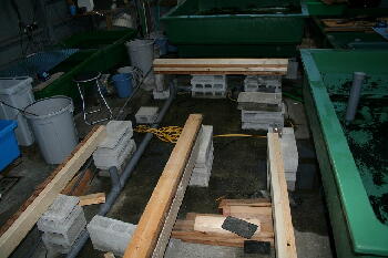 舟の下に物が置けるように、ブロックで高くしました。魚を移動させながらの作業でしたので思ったより大変でした。