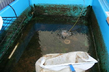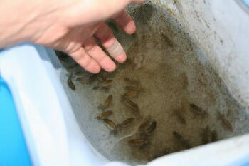尾の外骨を折ってしまうと、アウトですので丁寧に網で寄せて手で洗面器に移します。