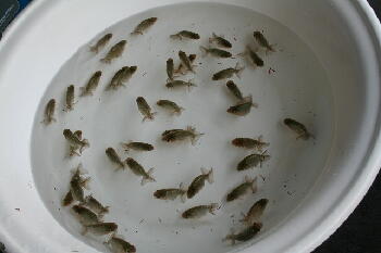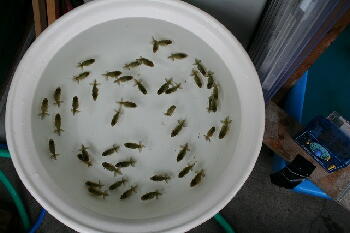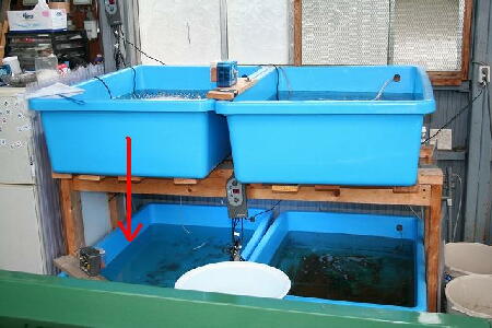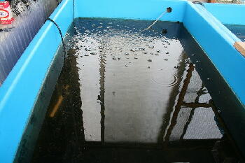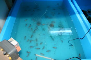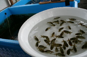 | <6月17日 スタート当日> 45匹を下段のプラ舟に放流 |