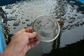 プラ舟では台所の排水用の網を使って、飼育水を抜いています。(もちろん100円ショップ用品)