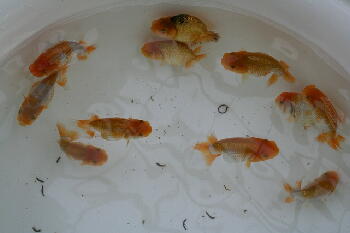 それでは、らんちゅうに戻りまして・・・プラ舟飼育の仔は本日水換えです。魚の匹数は変更していません。
