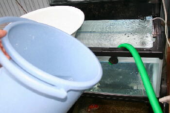 | 水道水を入れて、水温を合わせて、ハイポ(塩素抜き)を入れて水換え終了!(バケツはお湯) |